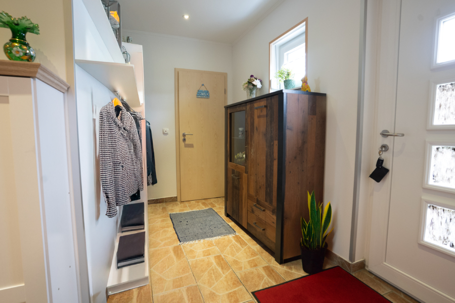 Bei dem neuwertigen Bungalow handelt es sich um eine attraktive Immobilie, die durch eine gehobene Innenausstattung besticht. Zu dem Objekt zählen neben drei schönen Zimmern + Hauswirtschaftsraum, ein großes Badezimmer (Badewanne, bodentiefe Dusche) und ein separates Gäste-WC. Alle Zimmer haben einen schönen Schnitt, sodass genug Platz zum wohlfühlen vorhanden ist. Im Wohnzimmer befindet sich außerdem ein Kachelofen, für gemütliche Abende. Über einen großen und geräumigen Flur, gelangen Sie in alle Räume.