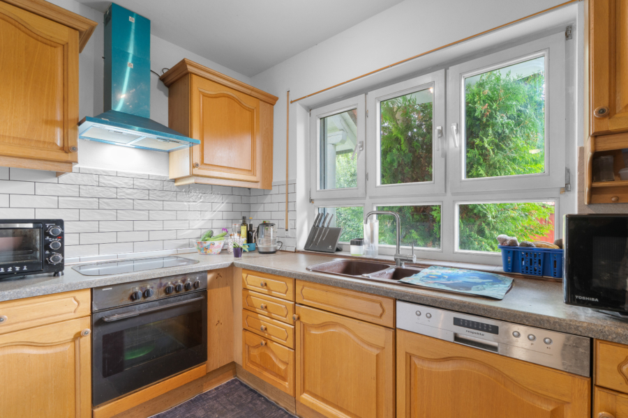 - Eine voll ausgestattete Einbauküche, die sofort nutzbar ist