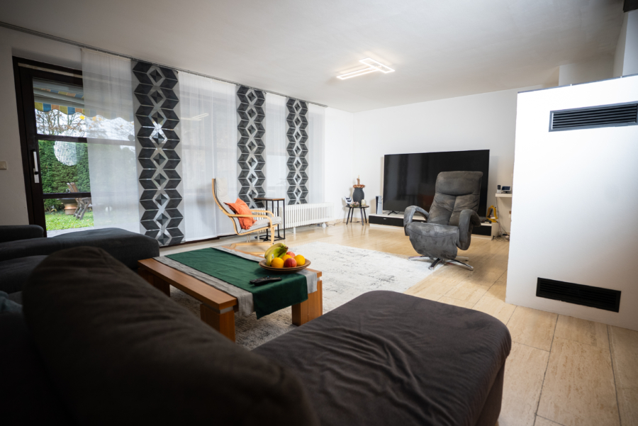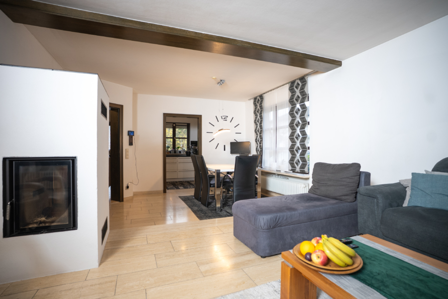 Bereits beim Betreten des Hauses wird deutlich, dass hier großer Wert auf Wohnqualität und Wohlfühlatmosphäre gelegt wurde. Das Erdgeschoss empfängt Sie mit einem hellen und großzügigen Wohnbereich, der durch große Fensterflächen lichtdurchflutet ist. Ein schöner Kamin sorgt nicht nur an kälteren Tagen für behagliche Wärme, sondern verleiht dem Raum auch eine besondere Wohnqualität. Der offene Übergang zur modernen Einbauküche schafft ein harmonisches Raumgefühl und ermöglicht kurze Wege im Alltag.