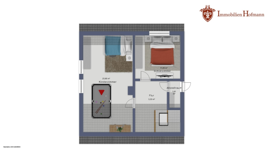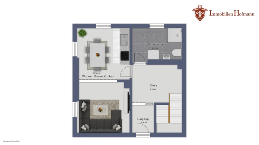 Dieses Exposé stellt kein Verkaufsangebot dar. Es dient allein Informationszwecken. Alle Angaben und Darstellungen in diesem Exposé wurden zwar mit größter Sorgfalt überprüft und zusammengestellt, sie können sich aber jederzeit ändern. Weder Immobilien Hofmann noch die übrigen Verantwortlichen sind verpflichtet, den Empfänger dieses Exposés über etwaige Änderungen zu informieren. Bei technischen Angaben wie z.B. Wohnungsgrößen, sind Abweichungen möglich. Bilder sind Interpretationen des Visualisierers. Bei den abgebildeten Grundrissvarianten, Innenraumdarstellungen und Abbildungen der Sanitär- und sonstigen Ausstattungen handelt es sich um unverbindliche Einrichtungsbeispiele. Maßgeblich für die geschuldete Ausstattung und Ausführung der betreffenden Immobilie sowie deren Grundriss sind allein der notarielle Kaufvertrag und die diesem beigefügten Baubeschreibungen, Pläne und Grundrisse. Weder Immobilien Hofmann noch die übrigen Verantwortlichen übernehmen eine Haftung für die Richtigkeit und Vollständigkeit dieses Exposés. Die Haftung für Vorsatz und grobe Fahrlässigkeit sowie für die Verletzung von Leben, Körper und Gesundheit bleiben unberührt.