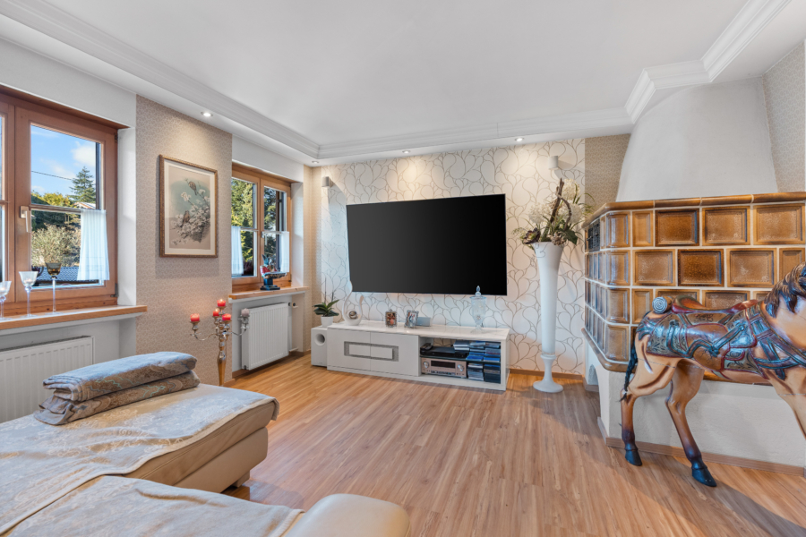 Im Wohnzimmer sorgt zudem ein zusätzlicher Holzofen für gemütliche Wärme und eine besonders behagliche Atmosphäre.