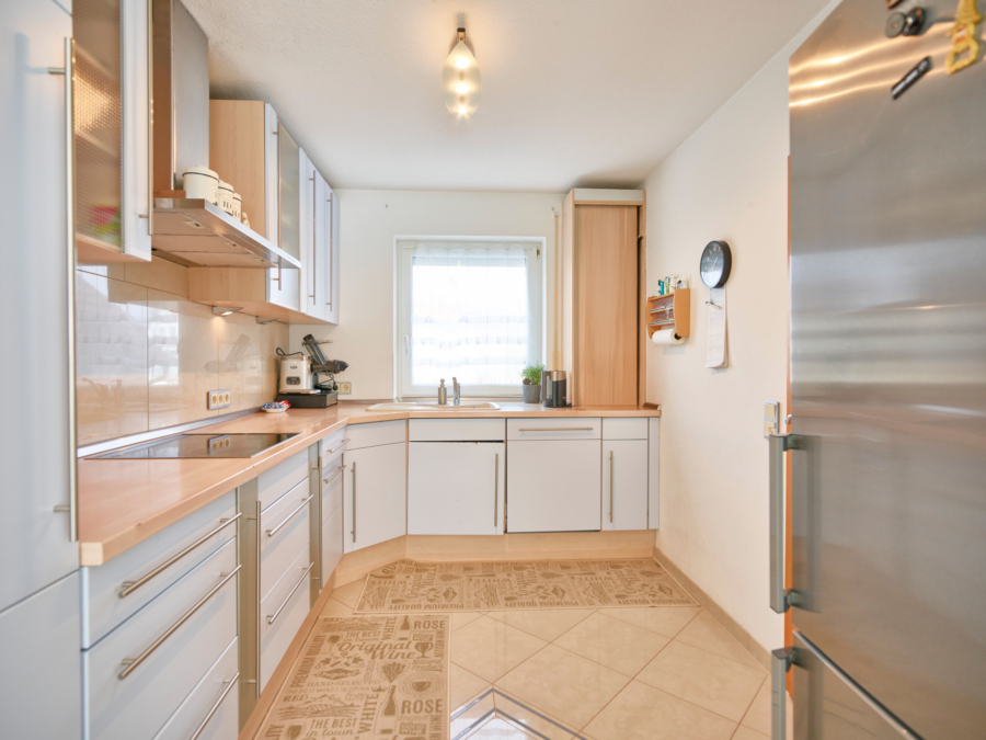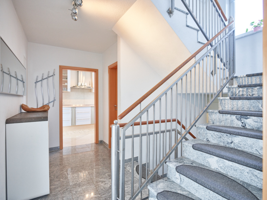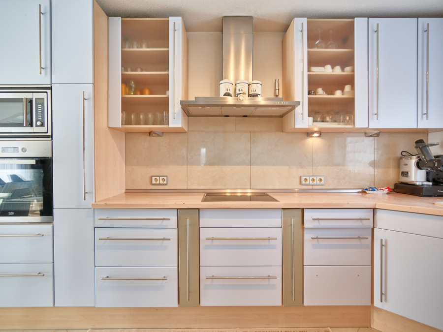 Die vorhandene Einbauküche ist funktional gestaltet und bietet ausreichend Platz zum Kochen und Genießen mit der Familie. Hochwertige Materialien wie Fliesen, Granit und Parkett verleihen den Räumen eine zeitlose und gepflegte Atmosphäre.