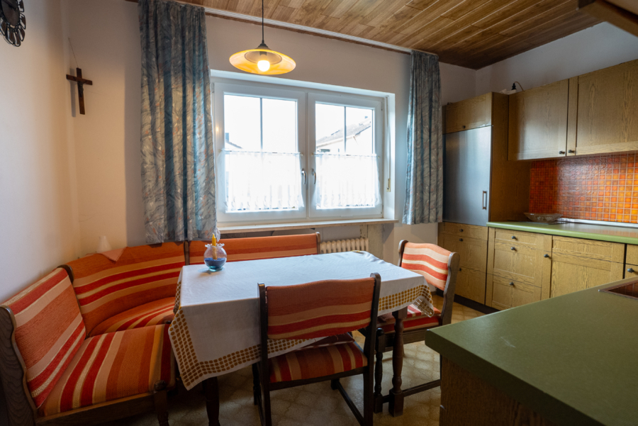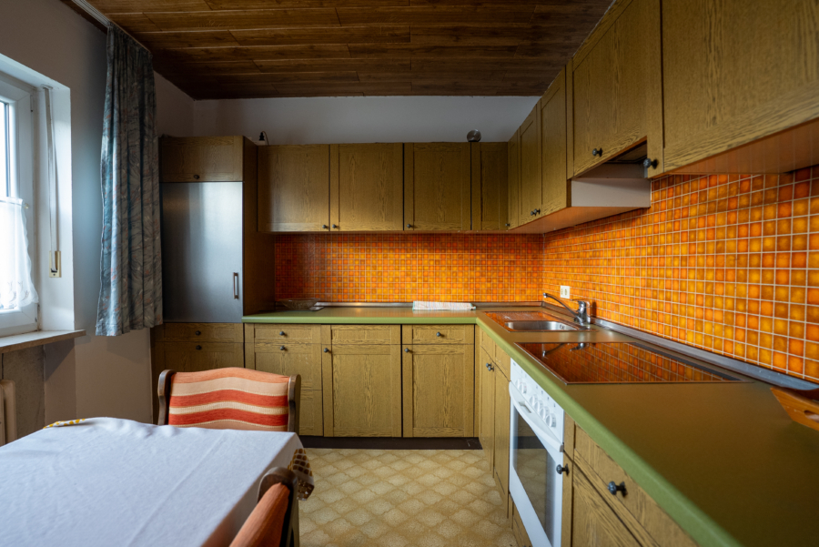 Das vollunterkellerte Wohnhaus verfügt über insgesamt zwei Bäder mit Badewanne, zwei separate WCs sowie eine zusätzliche Dusche im Keller. Die verschiedenen Bodenbeläge aus Vinyl, Fliesenteppich und Kork unterstreichen den wohnlichen Charakter. Eine Einbauküche im Erdgeschoss ist vorhanden und kann bei Bedarf problemlos entfernt werden. Für angenehme Wärme sorgt eine Ölheizung mit sechs Tanks, deren Alter ca. 25 Jahre beträgt.
