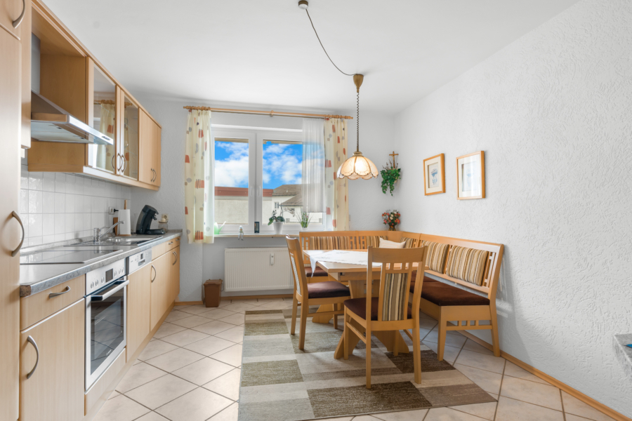 Zur Ausstattung zählen eine vorhandene Einbauküche sowie ein Kamin, der besonders in den kälteren Monaten für eine behagliche Wohnatmosphäre sorgt. Zusätzliche Nutzfläche steht im Keller zur Verfügung, ergänzt durch einen praktischen Abstellraum. Insgesamt vier Garagen bieten ausreichend geschützte Stellplätze direkt am Haus.