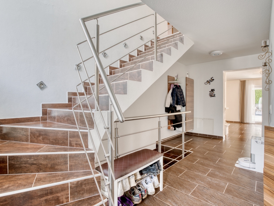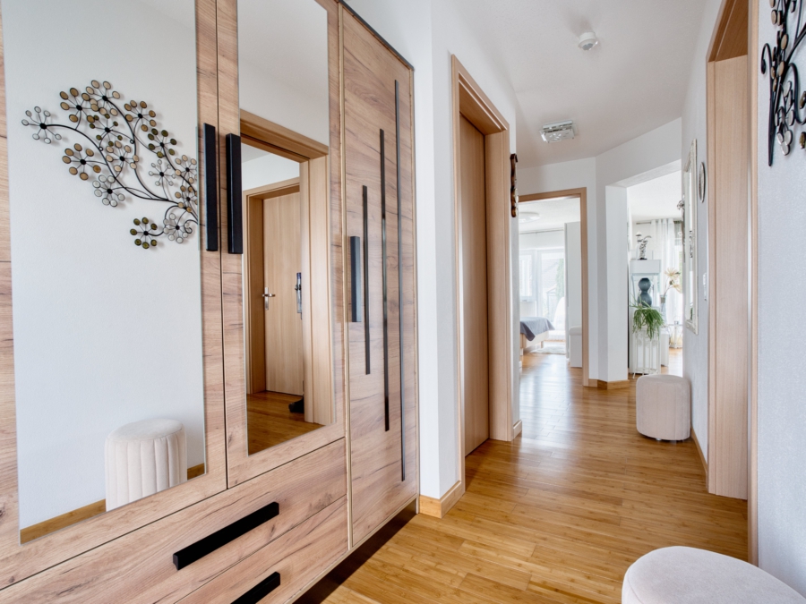Die Ausstattung des Hauses ist durchdacht und hochwertig: Parkettböden und Fliesen prägen das Erscheinungsbild, während die Fußbodenheizung in Verbindung mit einer modernen Erdwärmeheizung für angenehme Wärme und niedrige Betriebskosten sorgt. Beide Einheiten verfügen über komfortable Einbauküchen.