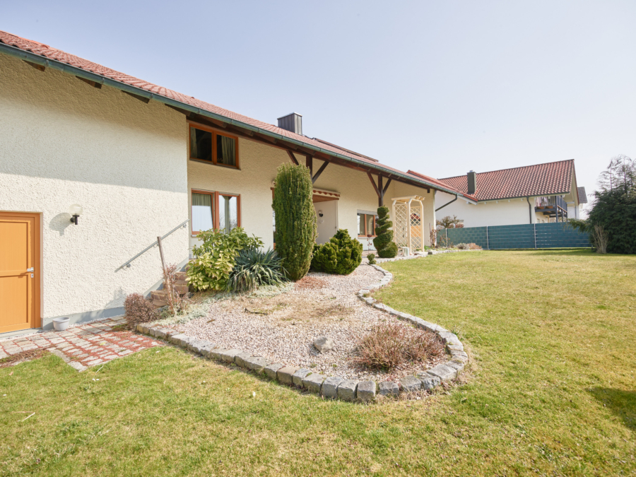 Der gepflegte, großzügig angelegte Garten bietet mit seiner weitläufigen Rasenfläche viel Platz für Freizeit und Erholung. Die große, überdachte Terrasse, ansprechend gestaltete Pflanzbereiche sowie ein kleiner Holzschuppen runden das Gesamtbild ab.