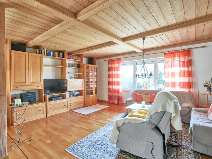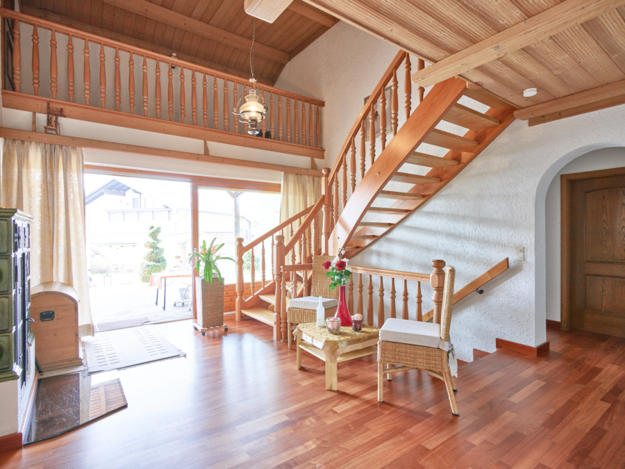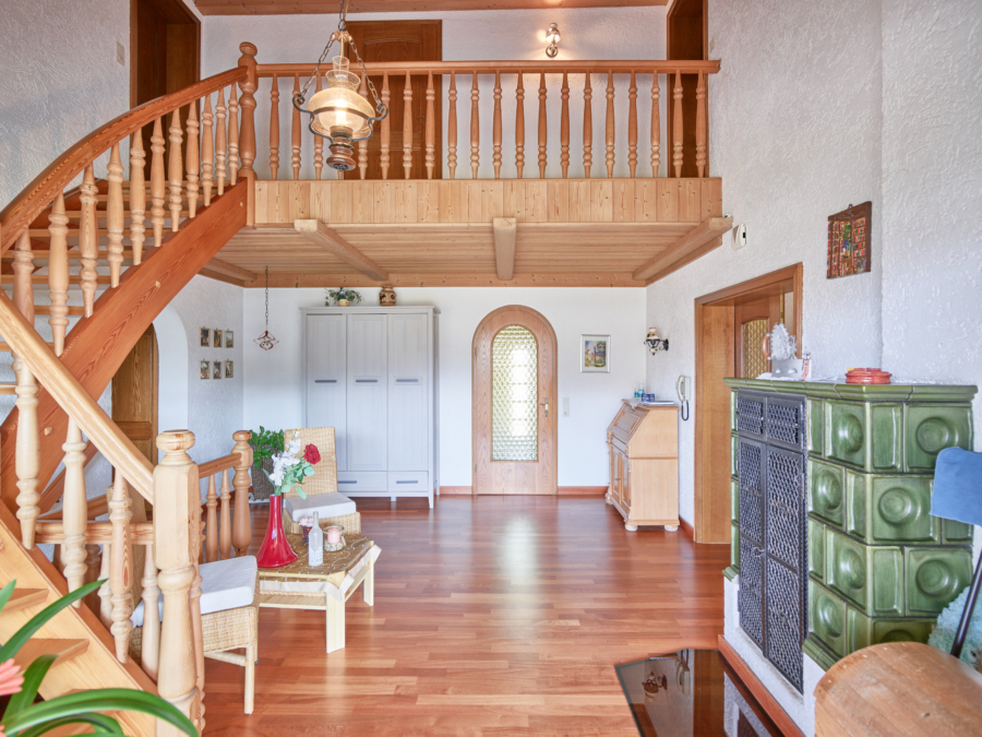 Im Erdgeschoss empfängt Sie eine offene, großzügige Diele, die durch einen Kachelofen eine angenehme Wohnatmosphäre schafft. Auch das Wohnzimmer wird mit dem Kachelofen beheizt. Von der Diele aus gelangen Sie direkt auf die sehr schöne, großzügige Terrasse.