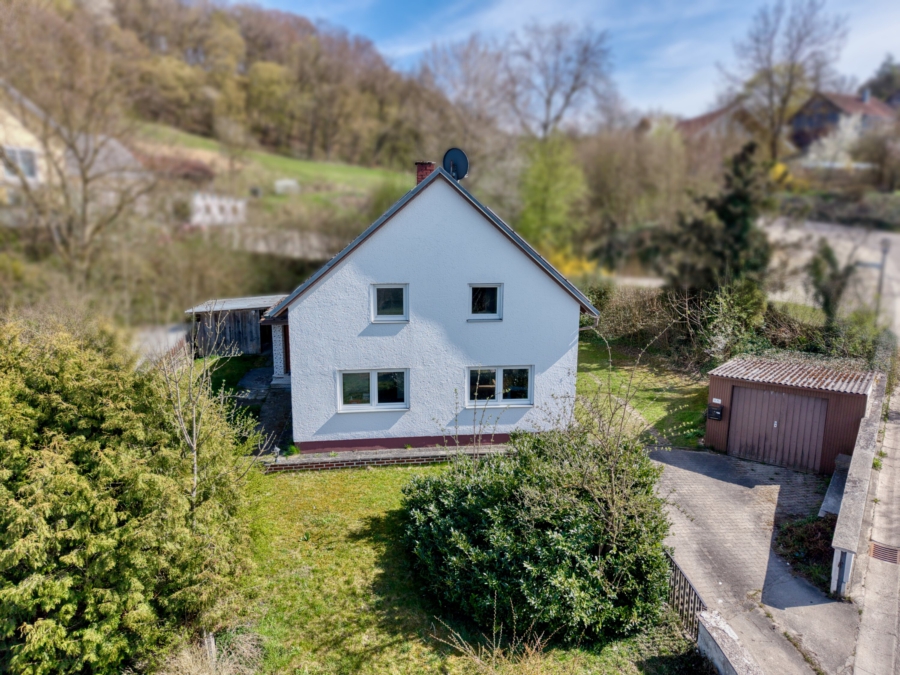 Die Raumaufteilung ist teilweise durch den Anbau geprägt, wodurch einzelne Durchgangszimmer vorhanden sind. Das Haus ist teilunterkellert. Eine Einzelgarage sowie Stellmöglichkeiten im Freien stehen zur Verfügung.