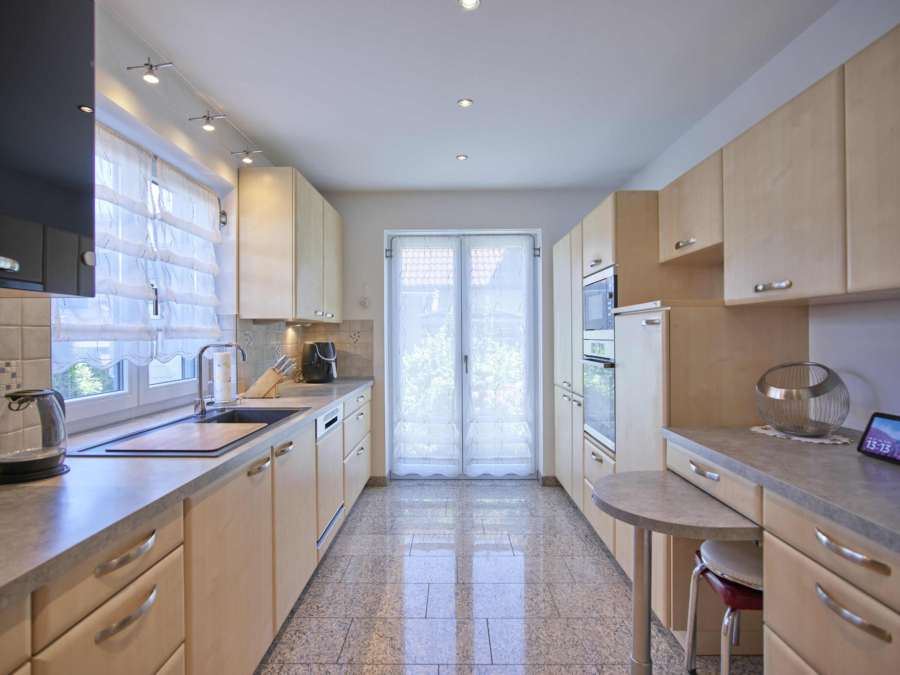 Der elegante Innenausbau besticht durch eine Vielzahl hochwertiger Bodenbeläge von Naturstein über Eichenparkett bis hin zu Teppich und modernen Fliesen. Die Einbauküche ist ein zusätzlicher Bonus, ebenso wie die bisher vorbereitete Planung für eine Kamininstallation im Wohnbereich.