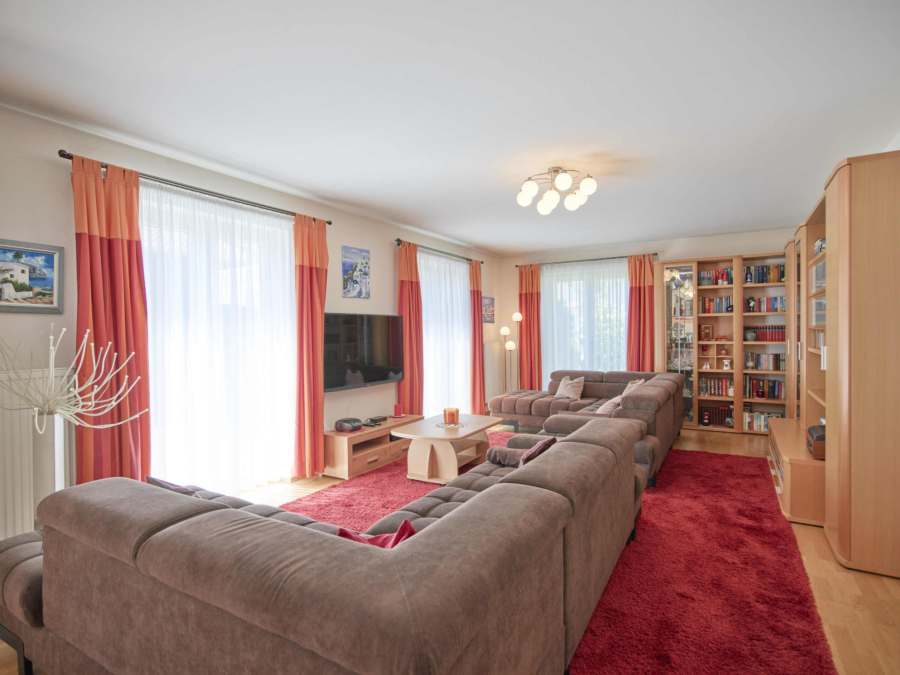 •Massive Bauweise, Ziegeldach, gedämmt, bodentiefe Fenster in Kunststoff-Alu mit 2‑fach Verglasung
