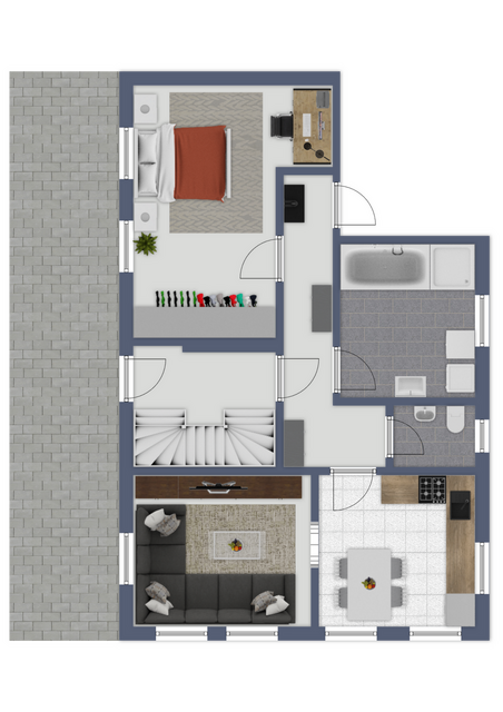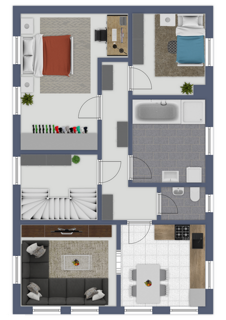 Diese Wohnanlage besteht aus drei gut geschnittenen Wohnungen, die sich über drei Etagen erstrecken. Jede Wohnung besticht durch einen smarten Grundriss und eine einfache und praktikable Ausstattung.