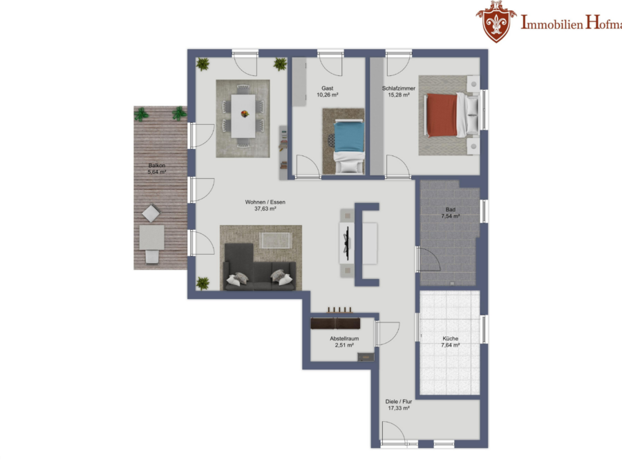 Dieses Exposé stellt kein Verkaufsangebot dar. Es dient allein Informationszwecken. Alle Angaben und Darstellungen in diesem Exposé wurden zwar mit größter Sorgfalt überprüft und zusammengestellt, sie können sich aber jederzeit ändern. Weder Immobilien Hofmann noch die übrigen Verantwortlichen sind verpflichtet, den Empfänger dieses Exposés über etwaige Änderungen zu informieren. Bei technischen Angaben wie z.B. Wohnungsgrößen, sind Abweichungen möglich. Bilder sind Interpretationen des Visualisierers. Bei den abgebildeten Grundrissvarianten, Innenraumdarstellungen und Abbildungen der Sanitär- und sonstigen Ausstattungen handelt es sich um unverbindliche Einrichtungsbeispiele. Maßgeblich für die geschuldete Ausstattung und Ausführung der betreffenden Immobilie sowie deren Grundriss sind allein der notarielle Kaufvertrag und die diesem beigefügten Baubeschreibungen, Pläne und Grundrisse. Weder Immobilien Hofmann noch die übrigen Verantwortlichen übernehmen eine Haftung für die Richtigkeit und Vollständigkeit dieses Exposés. Die Haftung für Vorsatz und grobe Fahrlässigkeit sowie für die Verletzung von Leben, Körper und Gesundheit bleiben unberührt.
